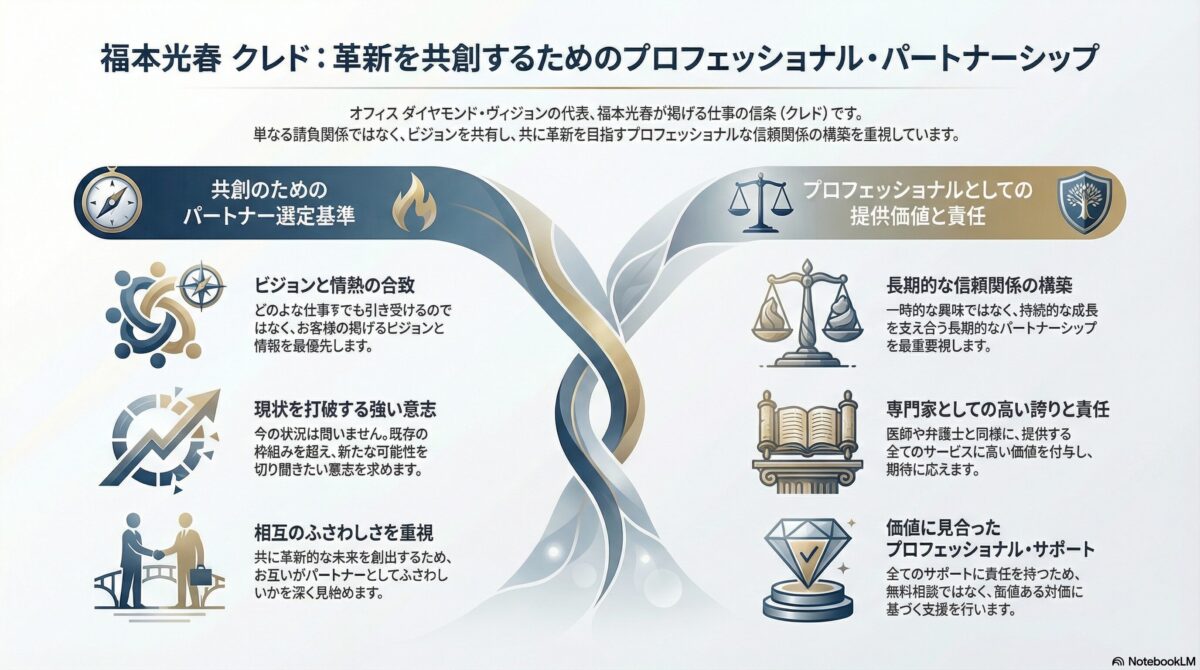 3.福本光春は、お客様との長期的な信頼関係を築き、継続的な成長をサポートすることを最も重要と考えています。ただ興味本位で「会いたい、話を聞きたい」というご依頼にはお応えできないので、あらかじめご了承願います。